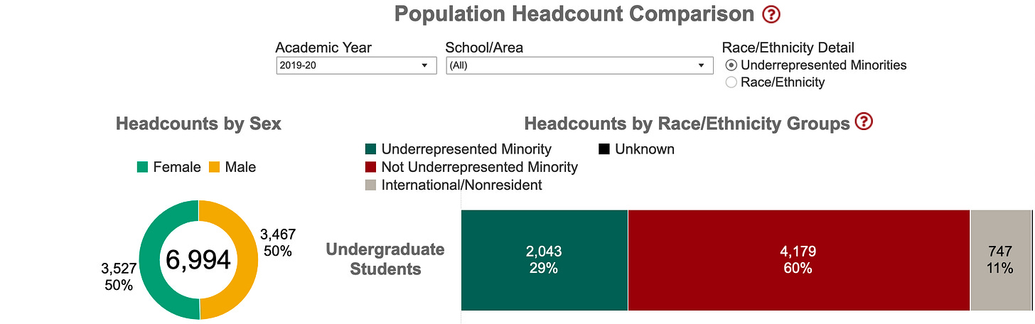 Like many similar diversity efforts in higher education, Stanford’s IDEAL offers only binary “underrepresented” minority and “not underrepresented” minority categories and binary male and female gender options. In the link you asked us to click for self-reporting of ethnicity and race there are six designations which boil down to a binary between White and Asian overrepresented vs. underrepresented people. Lumping all underrepresented minorities in one category elides the specific experience of each group and undermines the particular approaches that might be used in recruitment and rentention. Likewise, factoring such a monolithic group of “not underrepresented” overlooks the unique historical circumstances of many groups. The same goes for the gender binary, which misassigns many individuals.